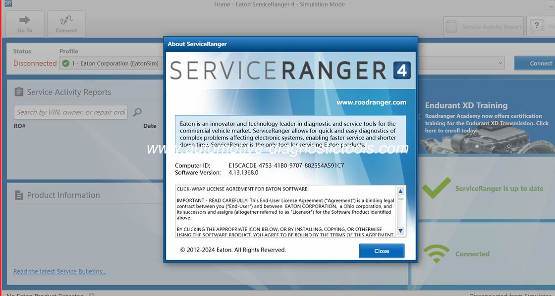 إيتون خدمة رينجر 4.13 العلامة التجارية: تحديث: 2025 النسخة: v4.13 الفئة: الشاحنات والشاحنات الثقيلة حجم الملف: 1.2 GB نوع البرنامج: DIAGNOSTIC المنطقة: جميع المناطق نظام التشغيل: ويندوز 10/11 (64 بت) لغة قاعدة البيانات: الإنجليزية لغة الواجهة:الإنجليزية والفرنسية والإسبانية 1.إيتون سيرفيس رينجر 4.13 هي أداة تشخيص وخدمة لشركات إيتون للنقل الآلي. 2يقدم ميزات مثل قراءة شفرة الخطأ ، ومراقبة البيانات ، وتقارير نشاط الخدمة ، ومعايرة المشبك ، إلى جانب القدرة على تحديث البرنامج وتغيير إعدادات التكوين. 3ميزة جديدة رئيسية في الإصدار 4.13 هي معالج الاتصال، المصممة لتبسيط عملية الاتصال إلى TECU و TCM للسيارة.